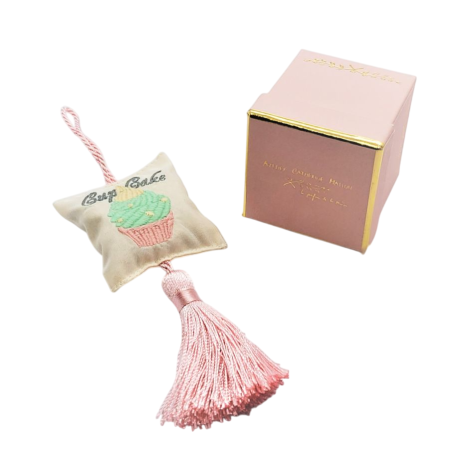 Boite contenant un coussin à parfumer, brodés d’un cupcake et enrichi d’un pompon.